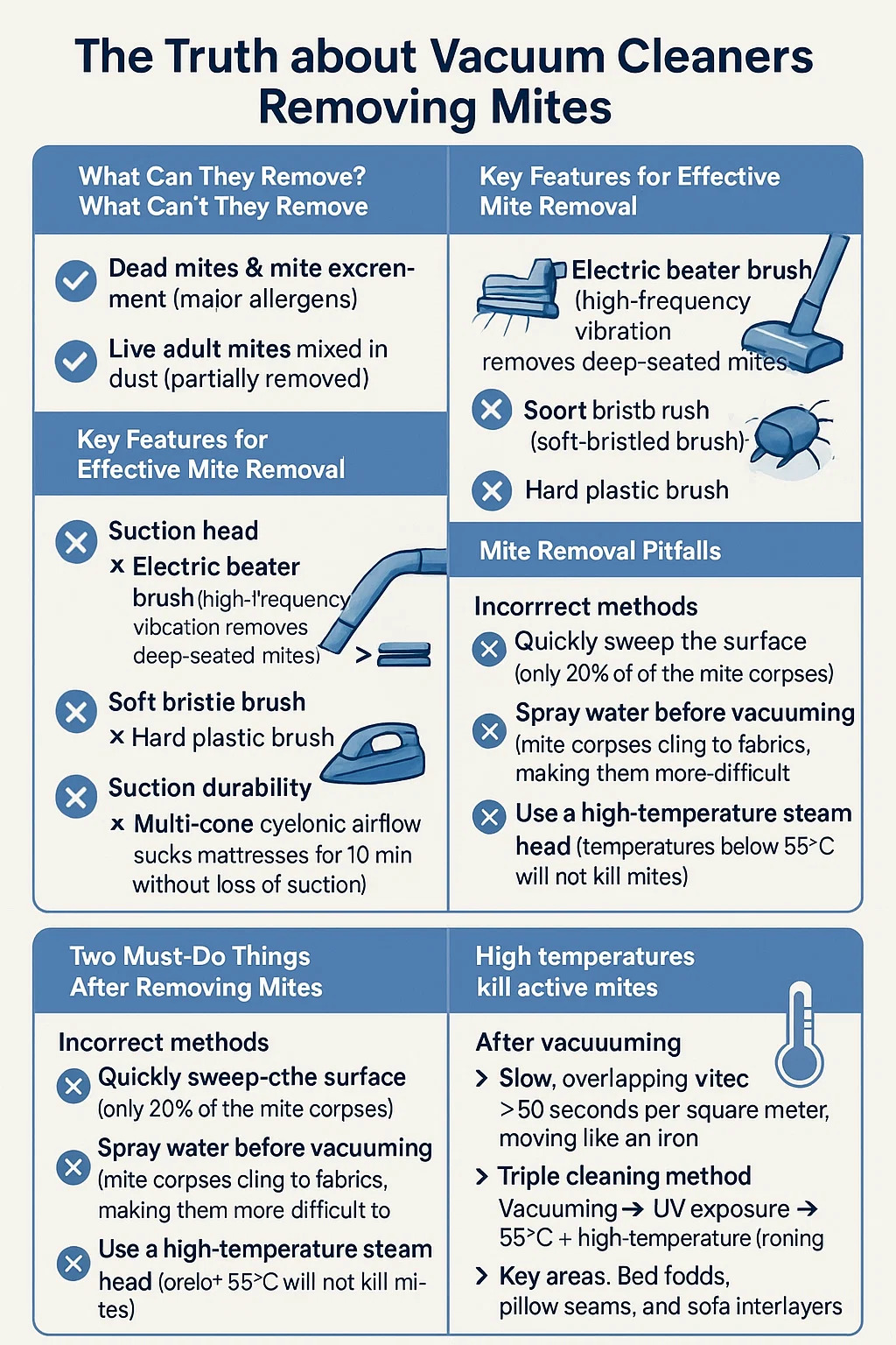 Métodos incorrectos: ** Barrer rápidamente la superficie (solo elimina el 20% de los cadáveres de ácaros) ** Rocíe agua antes de aspirar (los cadáveres de ácaros se adhieren a las telas, lo que las hace más difíciles de aspirar) ** Utilice un cabezal de vapor de alta temperatura (las temperaturas inferiores a 55°C no matarán a los ácaros)