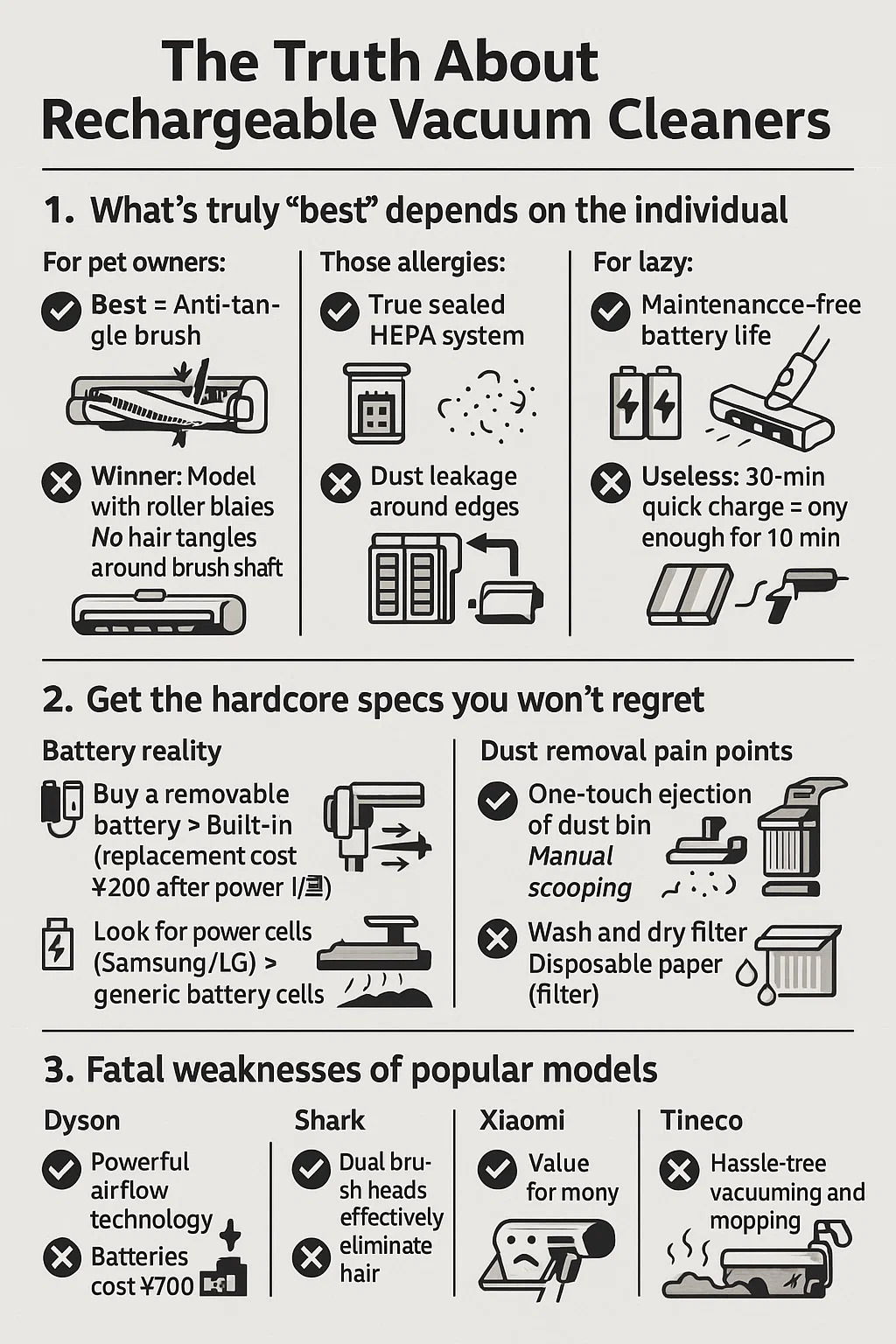 Para dueños de mascotas: "Mejor" = Cepillo antienredos Sin enredos de pelo alrededor del eje del cepillo. Ganador: Modelo con patines (chupa y corta simultáneamente, eliminando el desmontaje). Truco: potencia de succión de 200 AW, pero el cepillo giratorio requiere media hora de depilación manual.